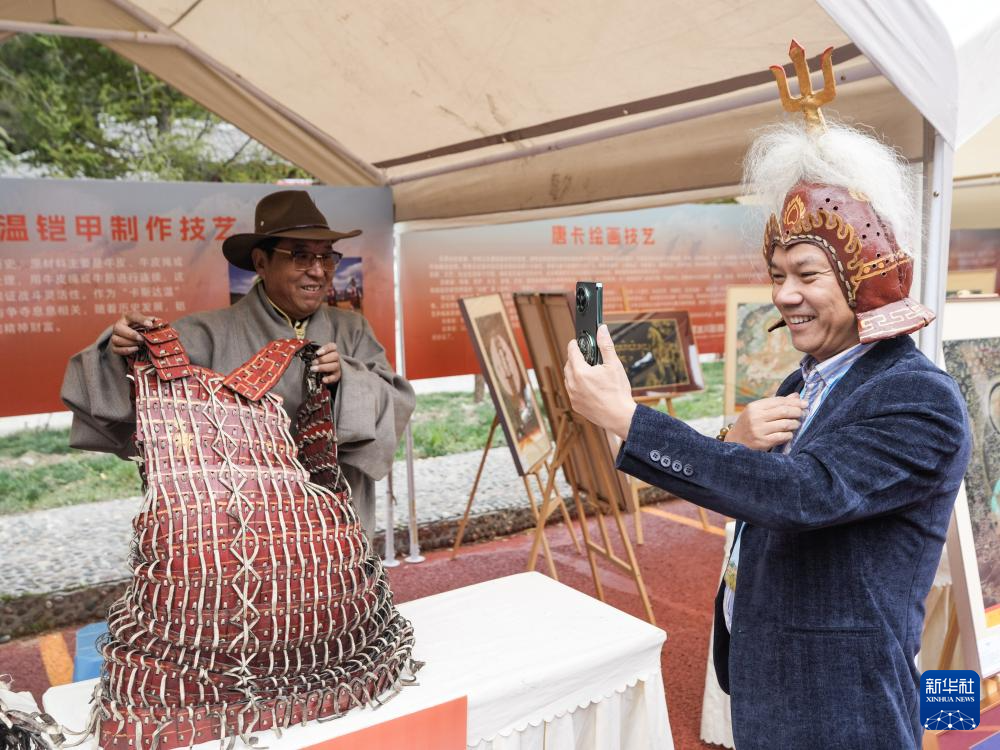 10月18日,在四川省阿坝州黑水县卡龙镇才盖村,游客体验穿戴国家级非遗项目“卡斯达温舞”中使用的铠甲。