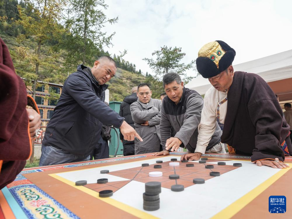 10月18日,在四川省阿坝州黑水县卡龙镇才盖村,当地群众在展示州级非遗项目“克额围棋”。
