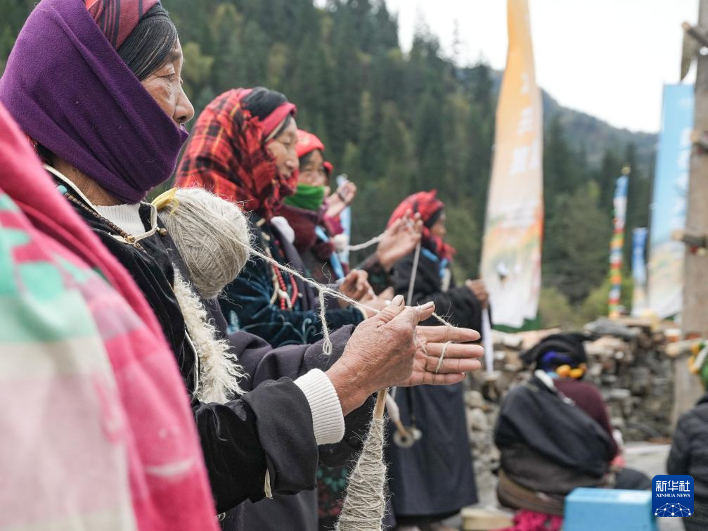 10月18日,在四川省阿坝州黑水县卡龙镇才盖村,当地群众在展示手工捻线技艺。
